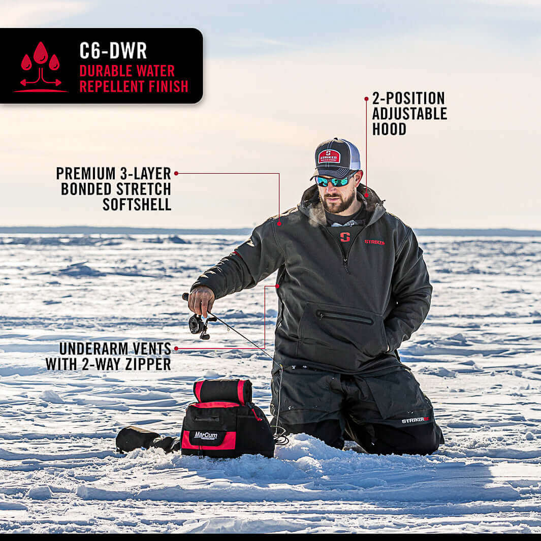 Torture tested in the North, the Striker® Renegade Pullover is as versatile as they come. From active days spent ice fishing to windy and cold days in the boat, there truly is no season the Renegade will not handle. Constructed of a durable windproof, breathable, and extremely water-resistant 3-layer softshell, it is as tough as 6AM ice. A fleece lined handwarmer pocket and front zippered stash pocket keep your hands warm and your essentials close. Zippered side vents help regulate temperature and adjustable hood and hem lock out the chill so you can enjoy the thrill.